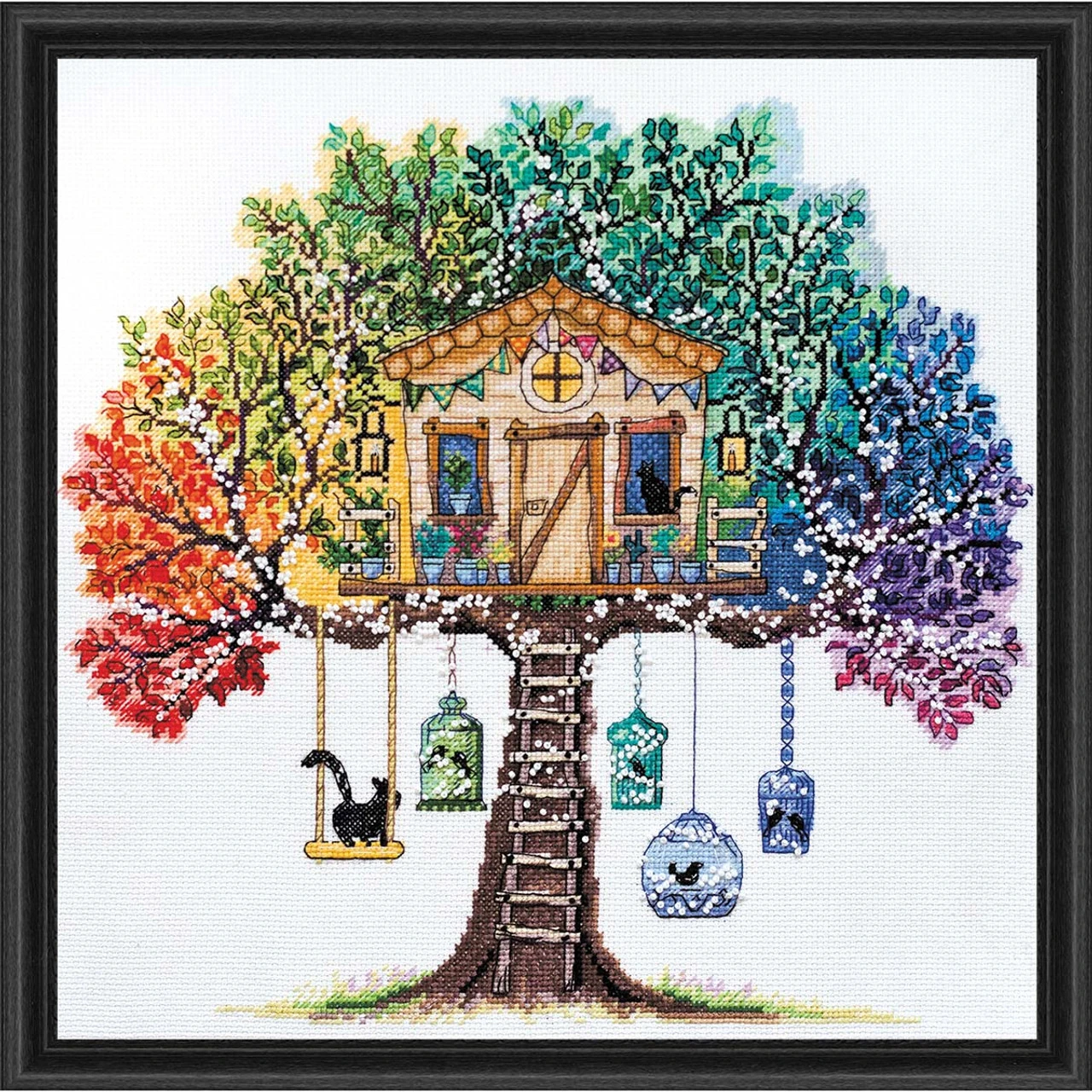 • Design features a treehouse in a tree with a rainbow of leaves with birdcages hanging below it and a black cat standing on a swing.