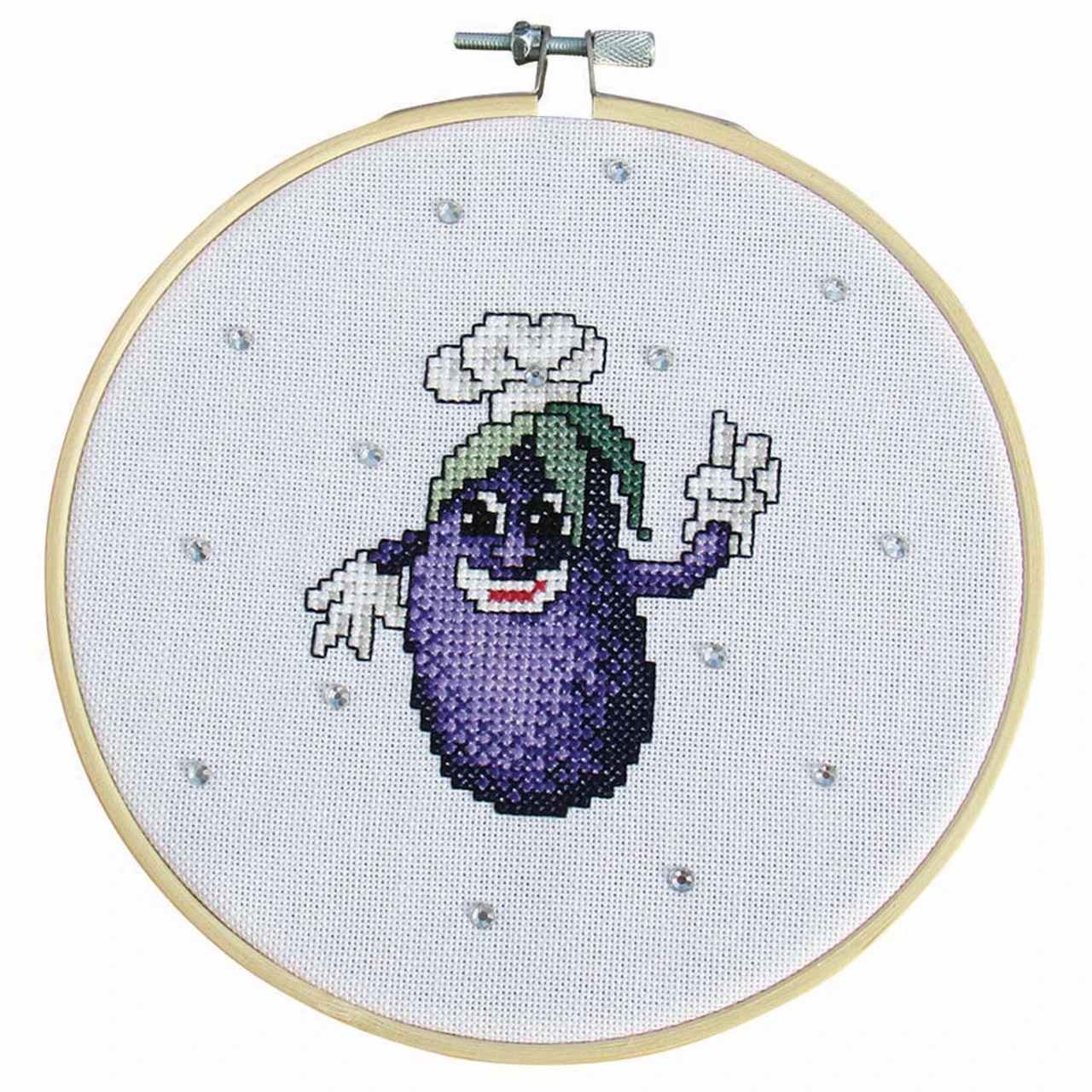 • Design features a dancing cartoon eggplant wearing a chef’s hat surrounded by rhinestones.