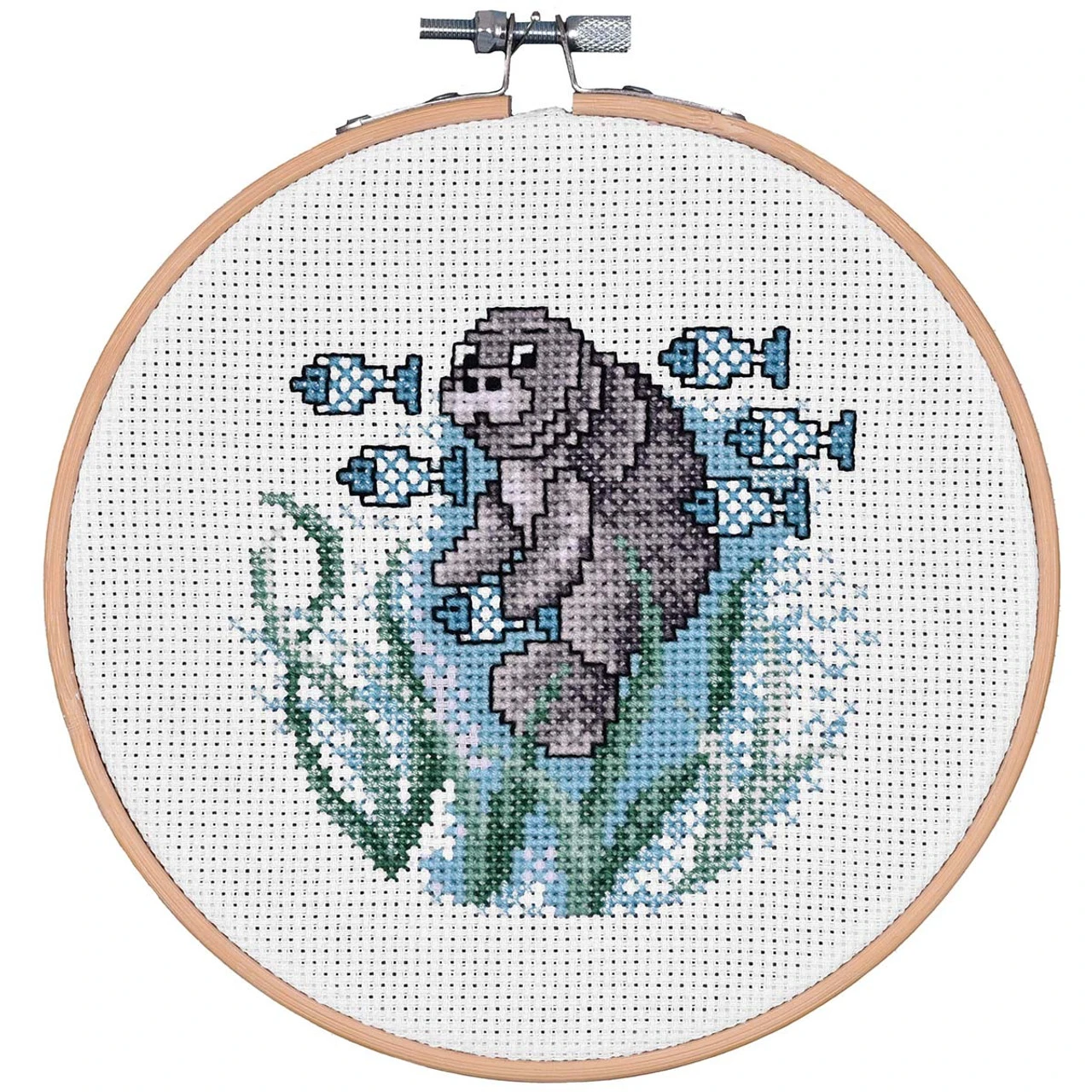 • Design features a manatee swimming in the seaweed along the ocean floor with a school of blue fish.