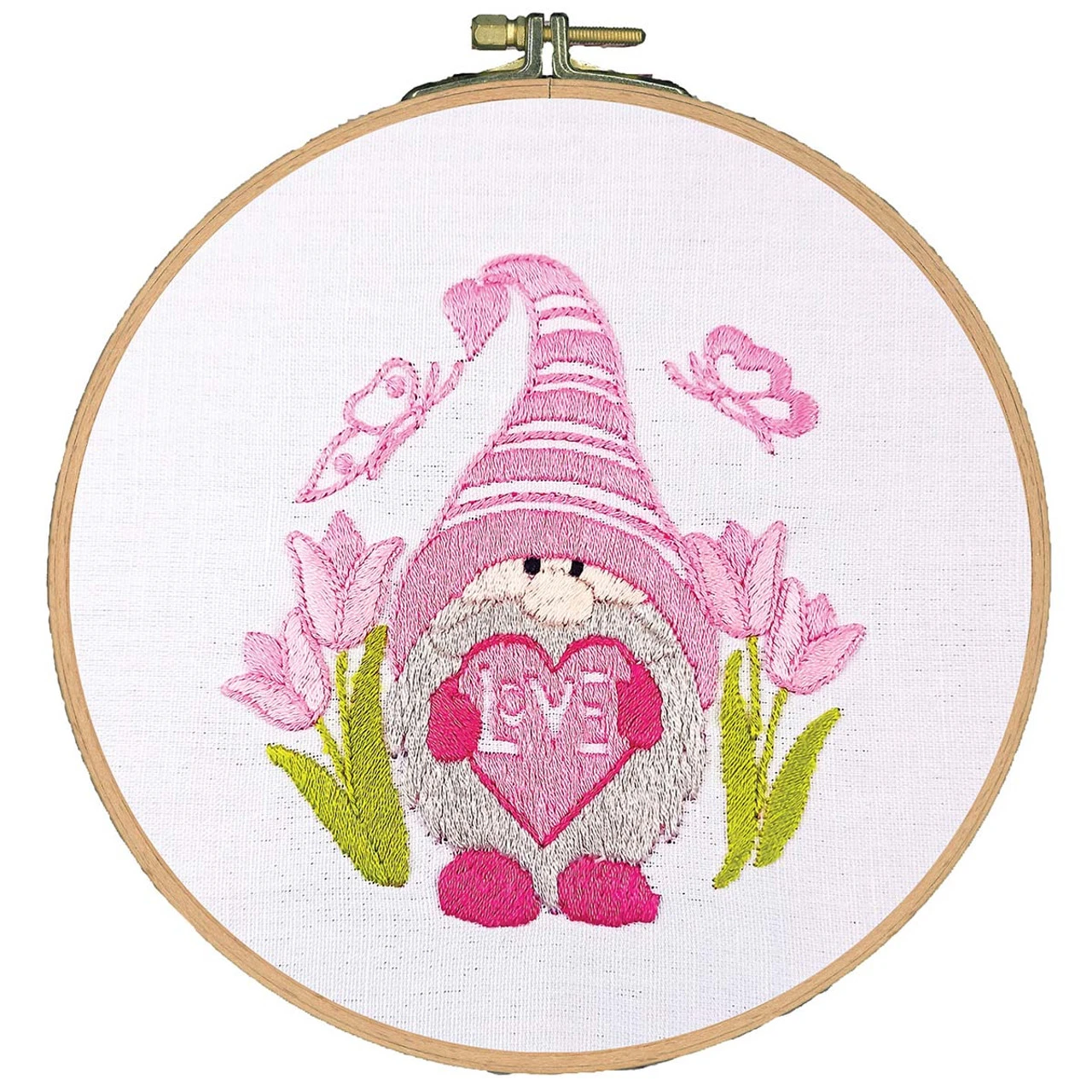 • Design features a gnome with a gray beard and pink hat holding a heart between two bouquets of pink tulips.