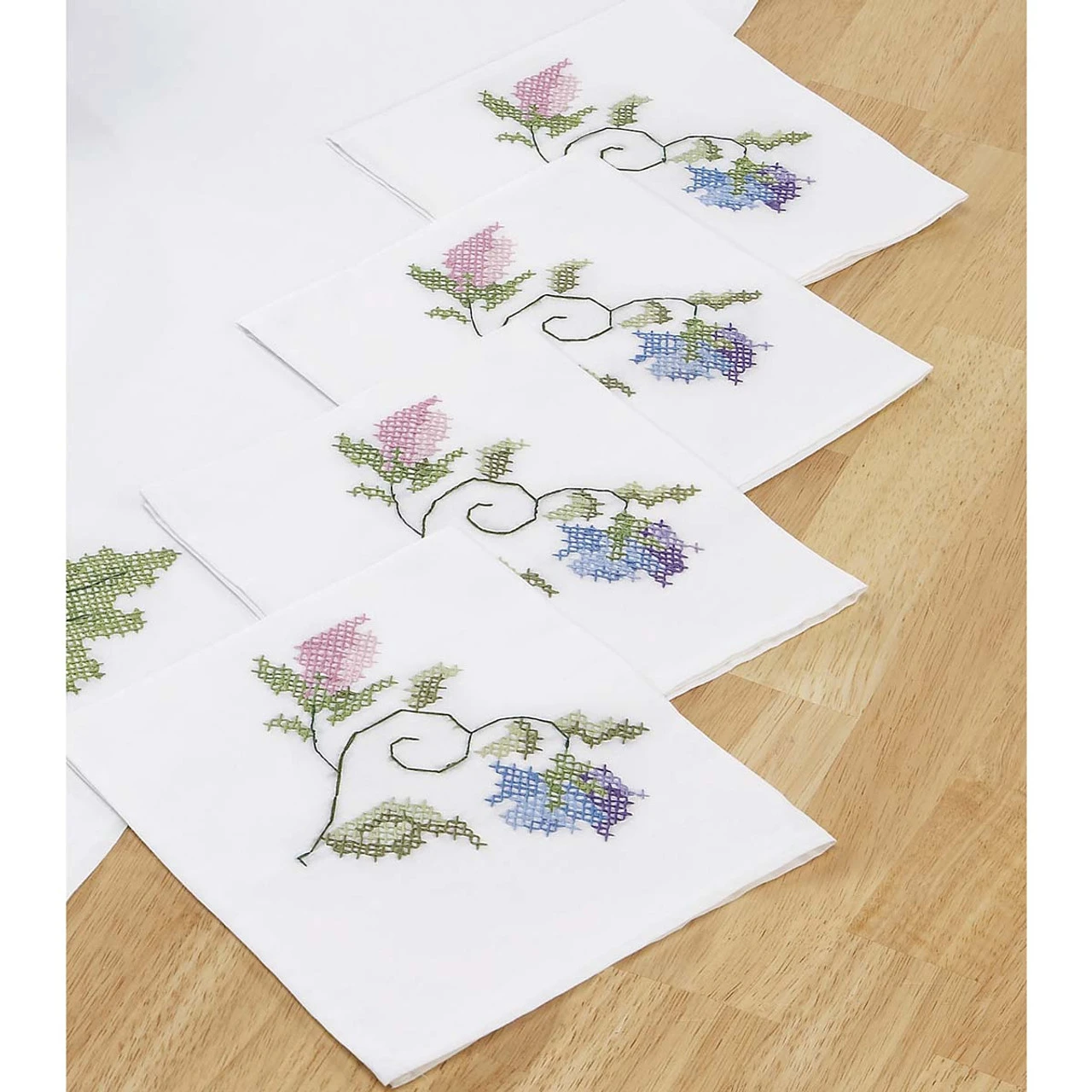 • The napkins are stamped for cross-stitch on white polyester/cotton fabric with a hemmed edge.