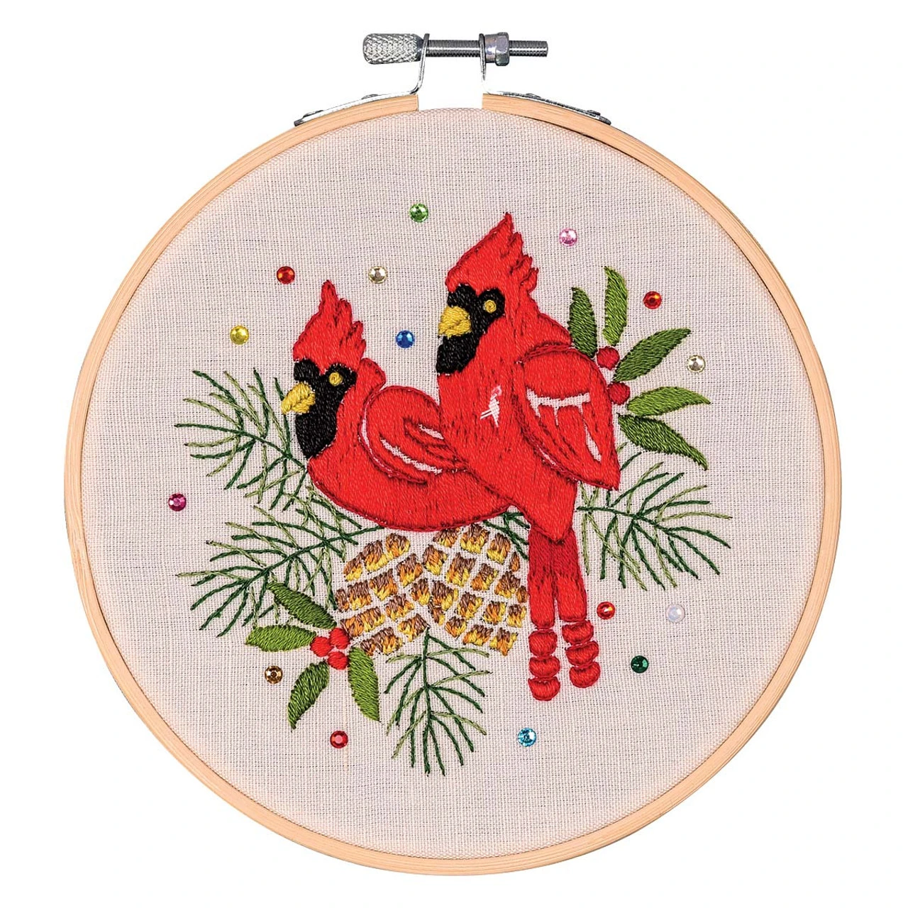 • This stamped embroidery kit includes stamped ivory cotton/linen fabric, cotton floss, rhinestone, bamboo hoop, needle, and instructions.