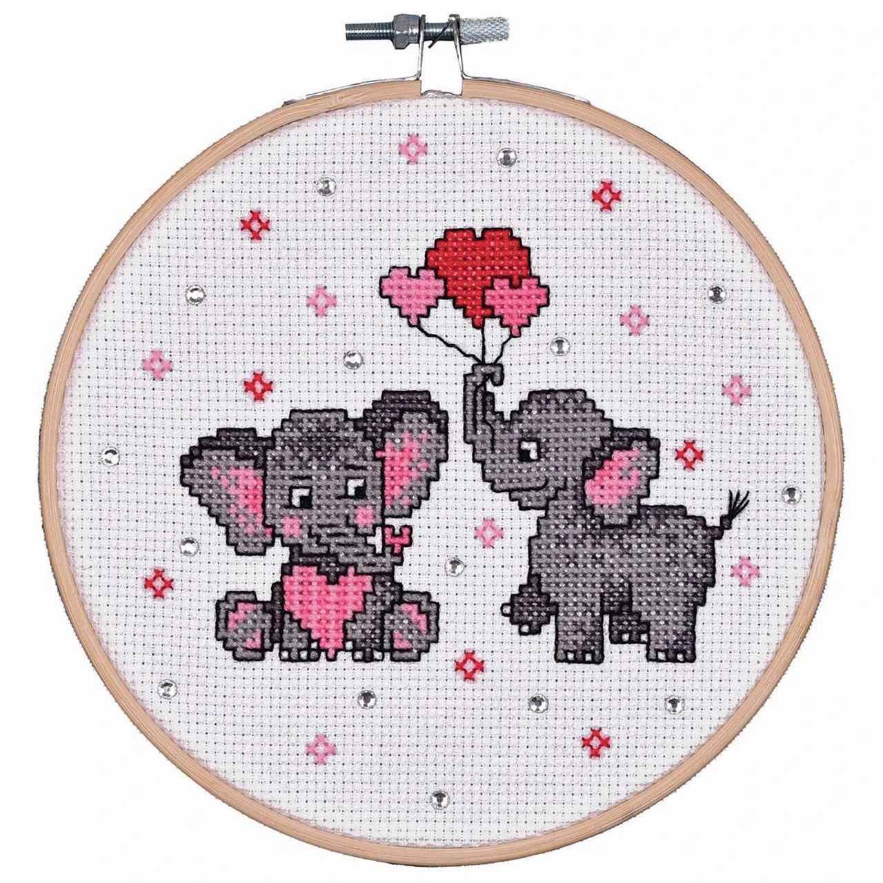 • Design features a baby elephant holding a large pink heart next to another baby elephant holding three heart-shaped balloons surrounded by pink hearts and sparkling acrylic gems.
