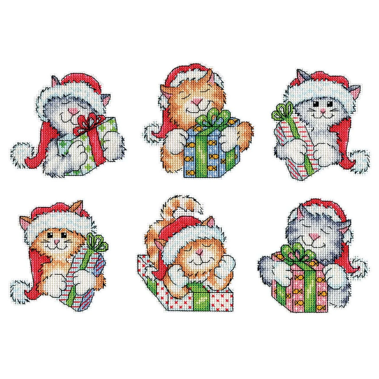• Designs feature orange and gray cats dressed in Santa hats holding wrapped Christmas presents.