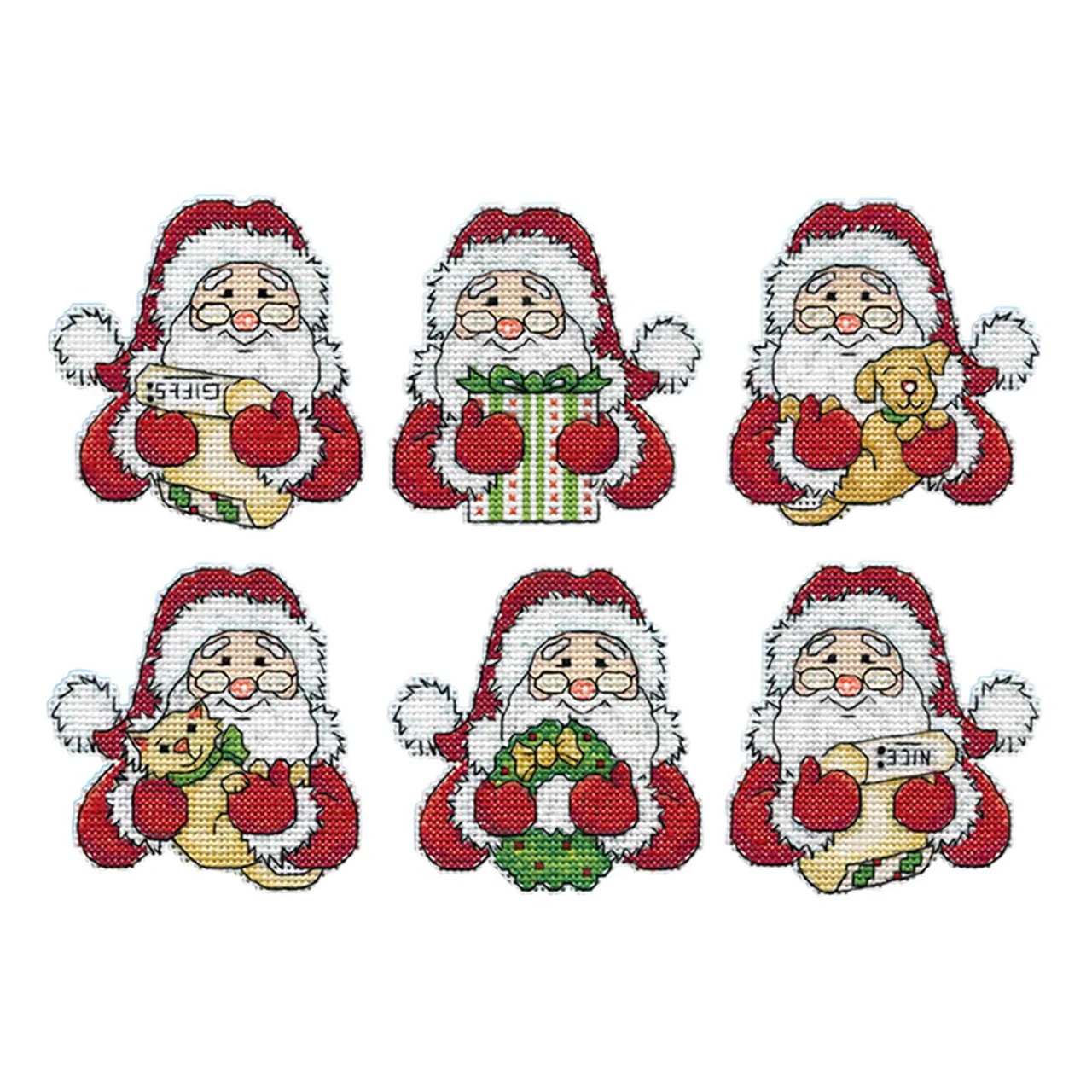 This complete counted cross-stitch kit includes 14-ct. plastic canvas, cotton floss, needle, and instructions to stitch all six designs shown. Each finished ornament measures 3½ x 3″ (8.9 x 7.6cm). Made in U.S.A.