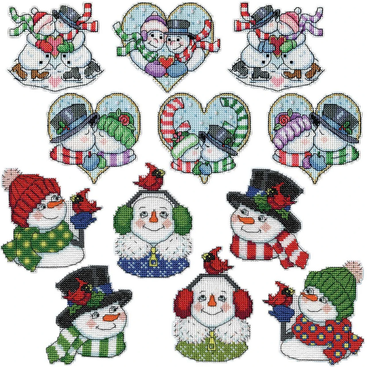 Friendly faces and snowy sweethearts can be displayed all season long! These adorable counted cross-stitch Christmas ornaments feature jolly snowmen making friends with little red cardinals and snowmen couples snuggling up on a winter day. The ornaments are stitched on 14-ct. plastic canvas. This durable, stiff plastic is perforated with round holes for stitching and will not unravel like fabrics can. It is a great fabric choice for both beginning stitchers and those with more experience. This complete counted cross-stitch kit includes 14-ct. plastic canvas, cotton floss, needle, and instructions to stitch all 12 designs. The 6 Snow Couple ornaments measure 3½ x 3½” (8.9 x 8.9cm) each. The 6 Snowmen ornaments measure 3 x 3½ (7.6 x 8.9cm) each. The designs also make fun package tags to decorate Christmas presents. Made in U.S.A.