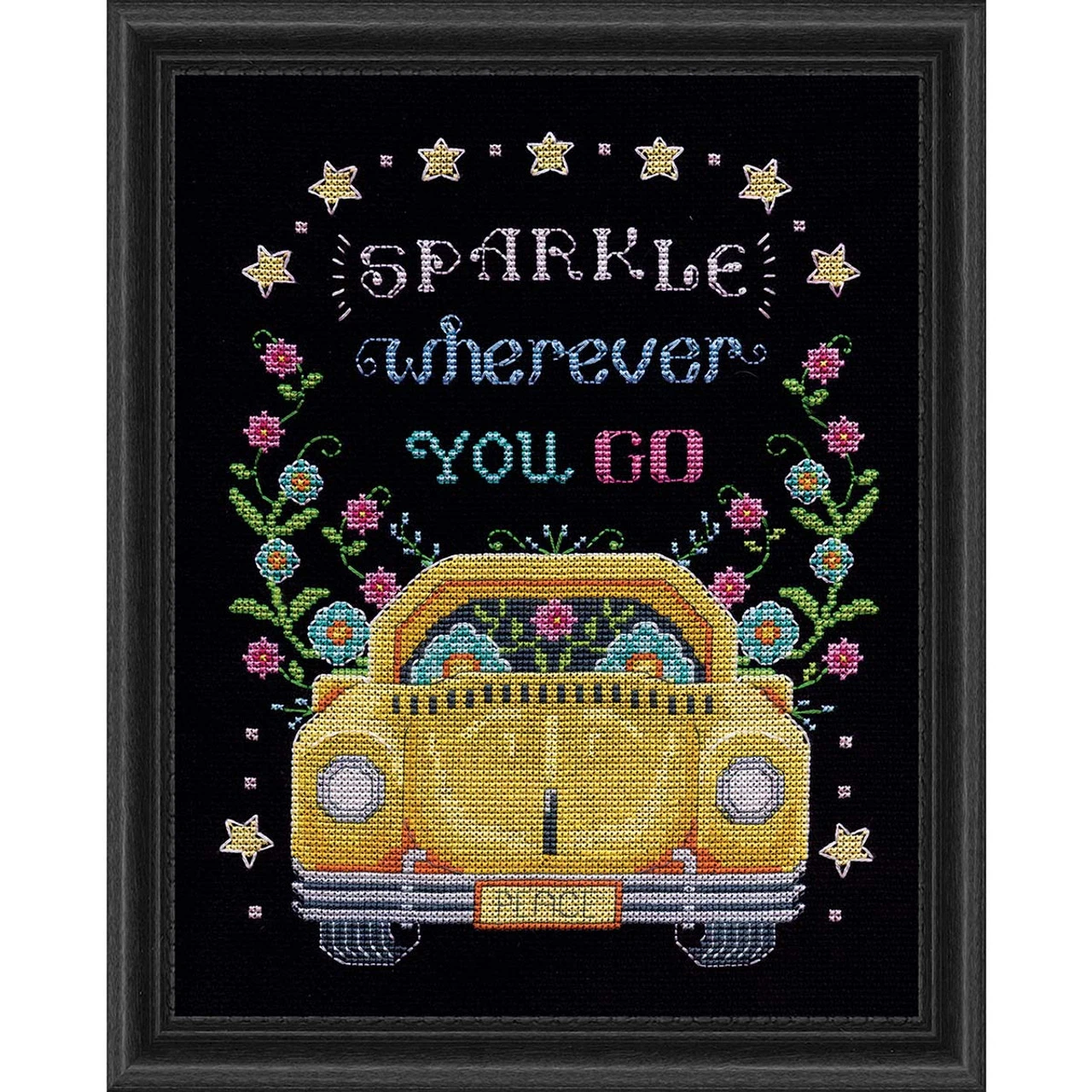 • Design features the words “Sparkle Wherever You Go” framed by stars and pink flowers with a bright yellow car.