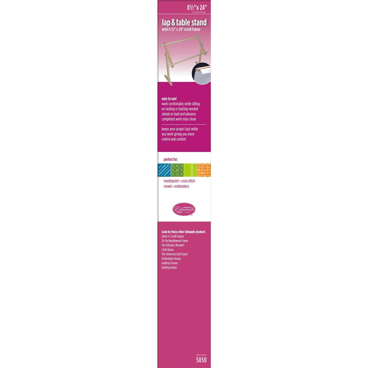 Work with both hands free for better control with this fully adjustable stand with a split rail scroll frame. Perfect for stitching on the couch, in bed, or in the car! 24 × 14″ (61 x 36cm). 8 × 24″ work area. Fits fabric up to 21″ (53cm).