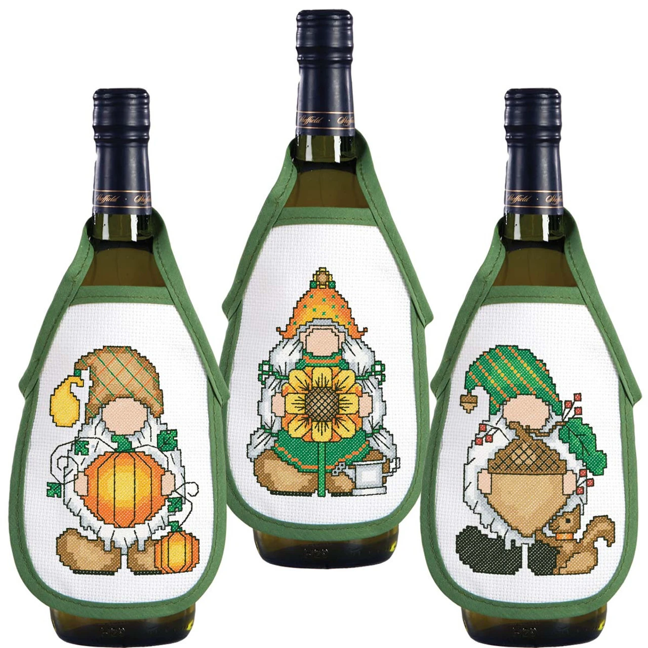 • This counted cross-stitch kit includes pre-finished white 14-ct. aida bottle aprons with an olive green bound edge, cotton floss, floss organizer, needle, and instructions.