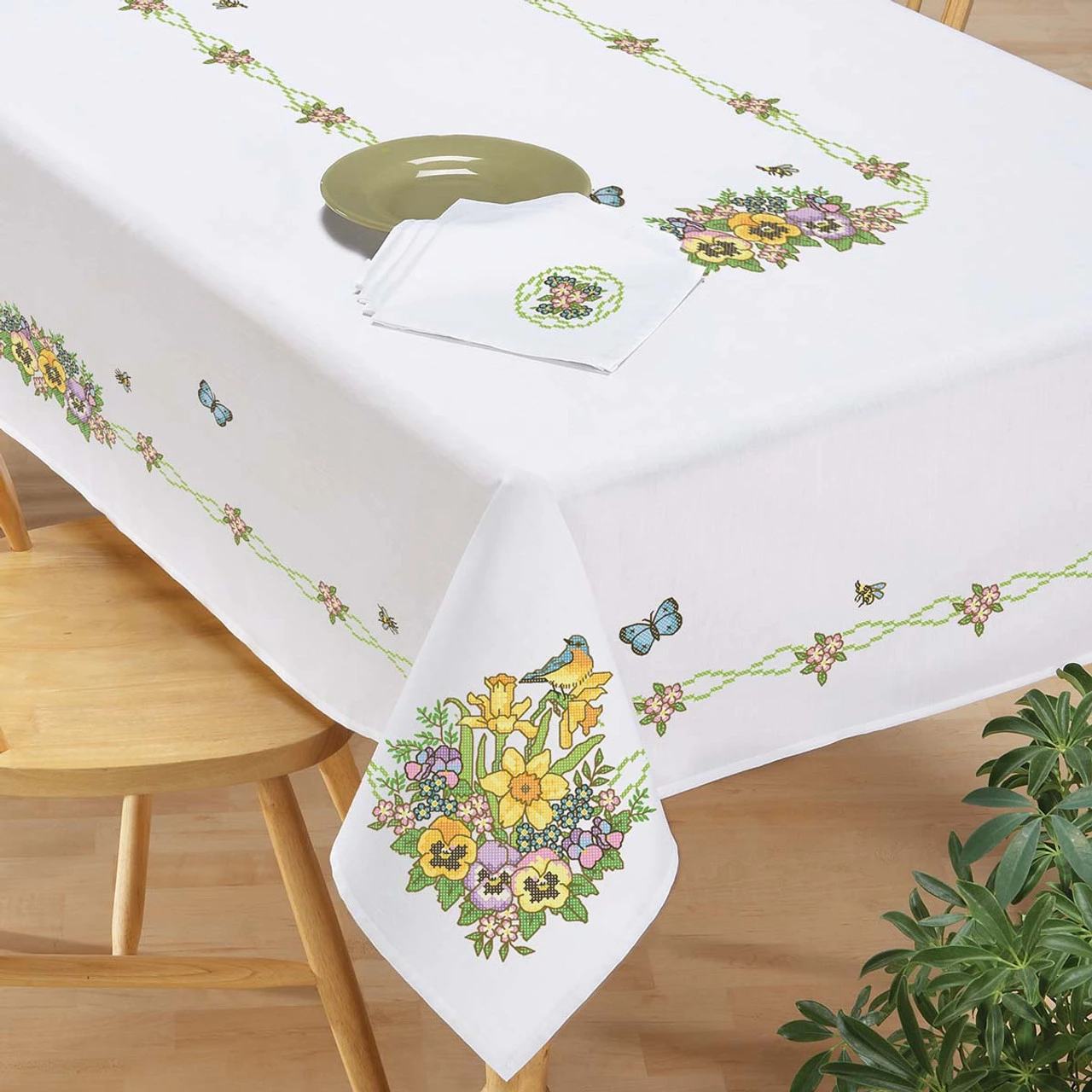 Dinner parties become garden parties with these lively floral linens. Stamped for cross-stitch on white polyester/cotton fabric with a finished edge. Imported.