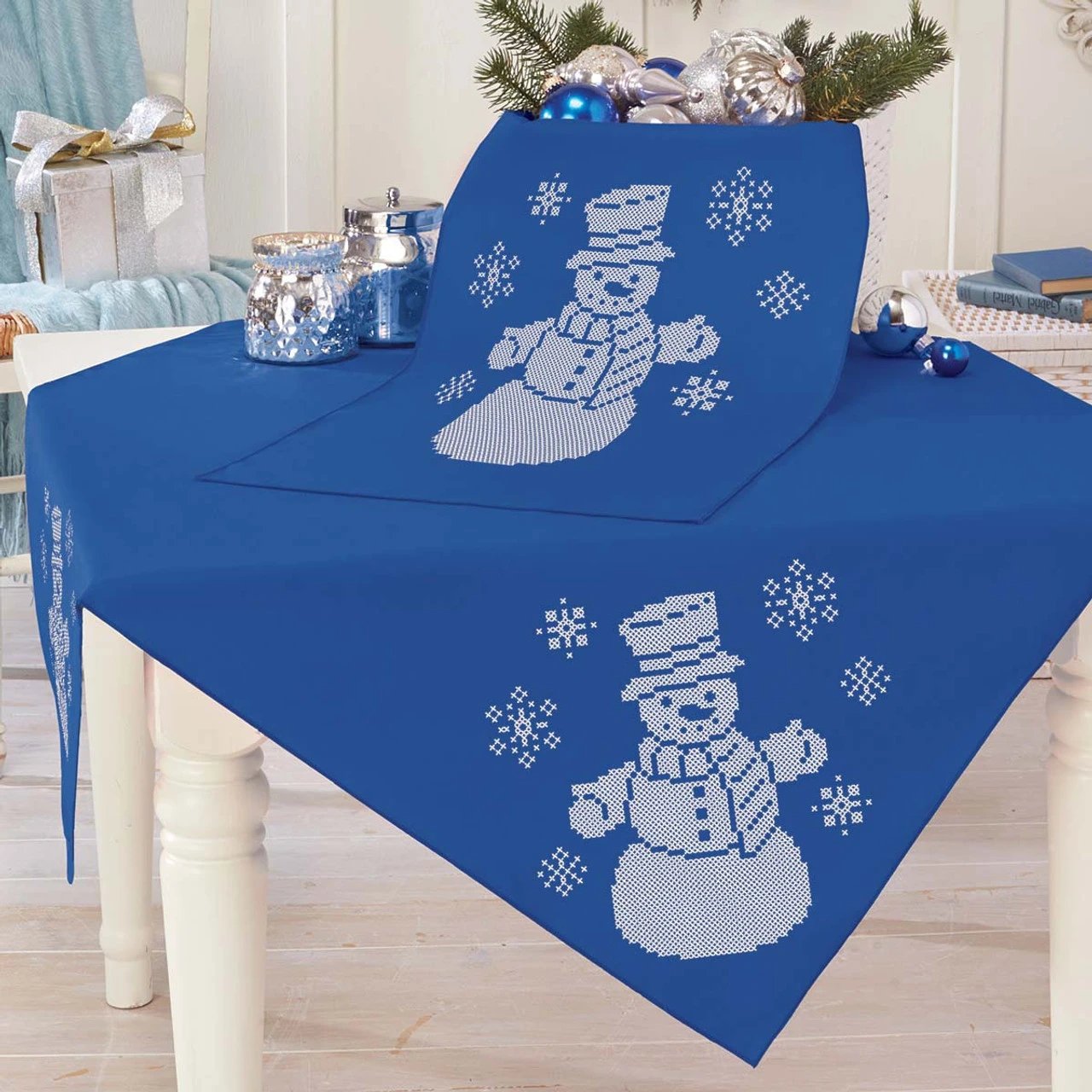 Herrschners Blue Snowman Table Topper & Runner Stamped Cross-Stitch Kit