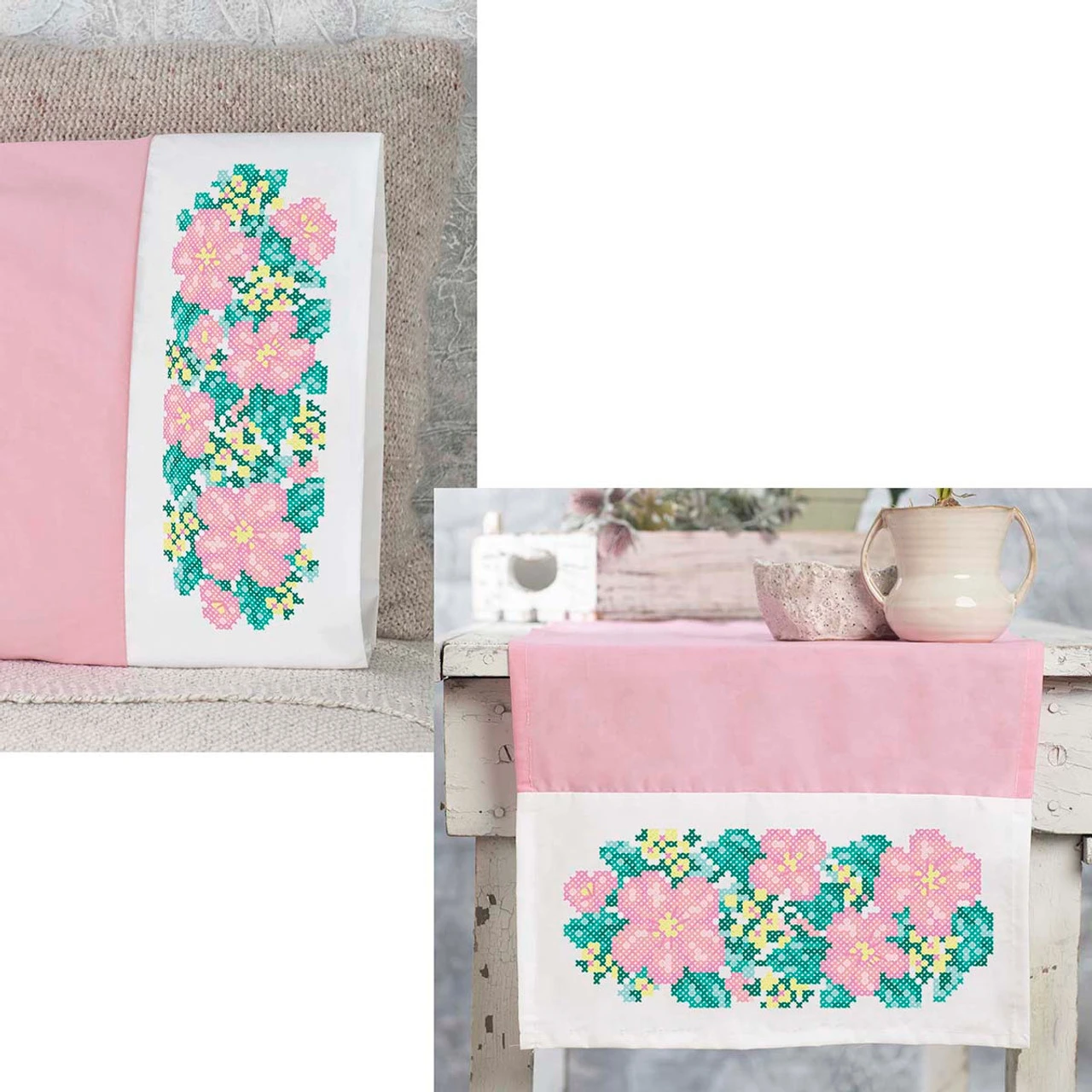 Beautiful florals create a haven of relaxation in your bedroom. Stamped for cross-stitch on pink polyester/cotton fabric with a white cuff. 20 x 30″ (51 x 76cm) pillowcase pair; 14 x 44″ (36 x 112cm) dresser scarf. Imported.