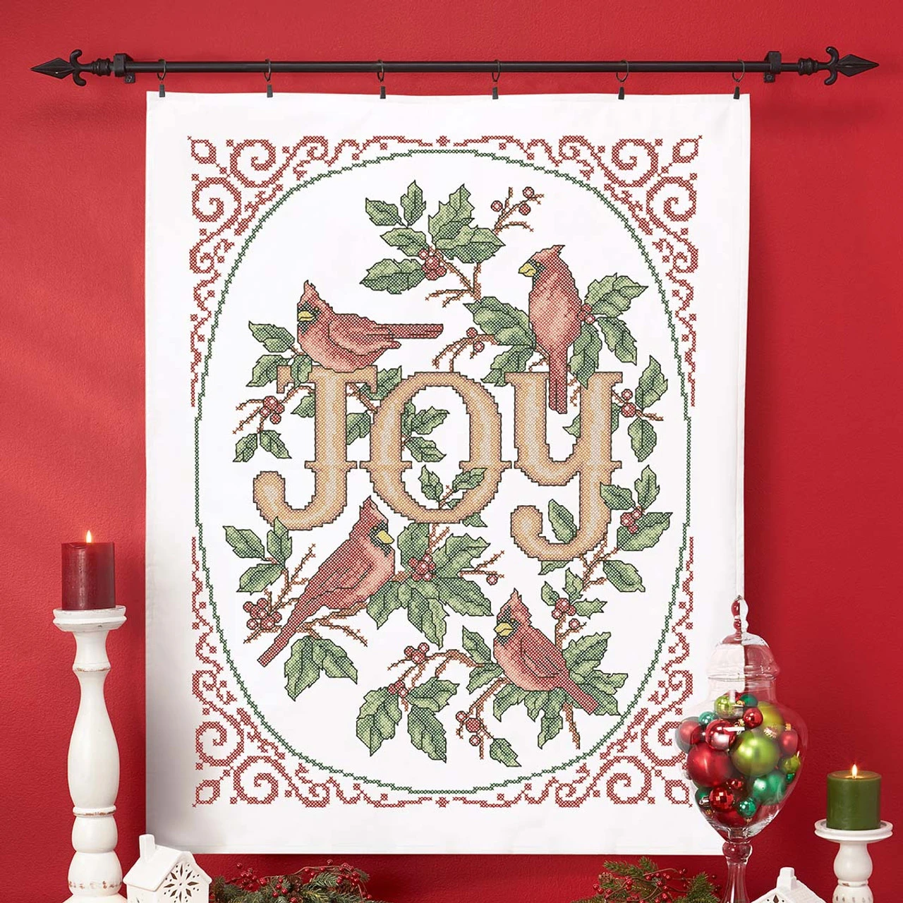 Elegant cardinals and filigree-style stitching are a joyful addition to your holiday décor. Stamped for cross-stitch on white cotton/polyester fabric. Kit includes cotton floss and needle. 34 x 43″ (86 x 109cm). Made in U.S.A. and imported.