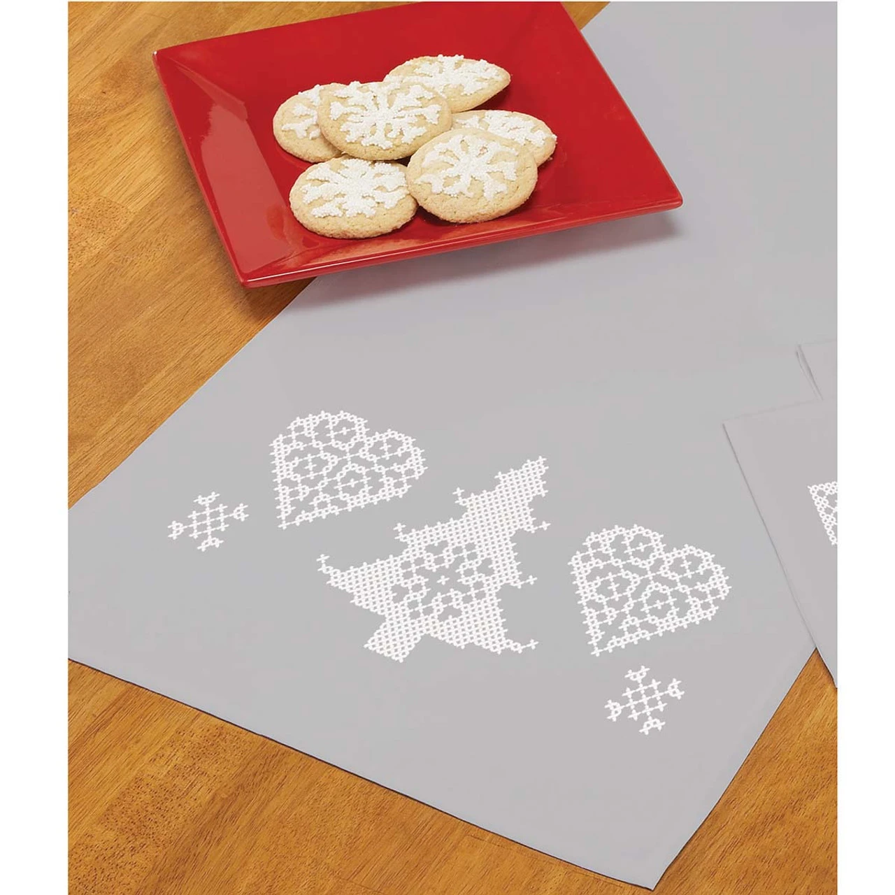 • This pre-finished table runner is ready for stitching with a white Christmas tree, hearts, and snowflakes.