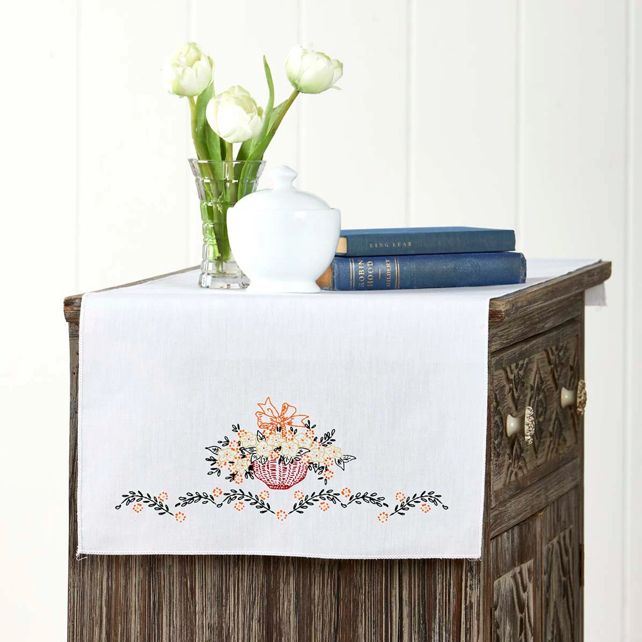 • The dresser scarf is stamped for embroidery on pre-finished white polyester/cotton dresser scarf with a perle edge.