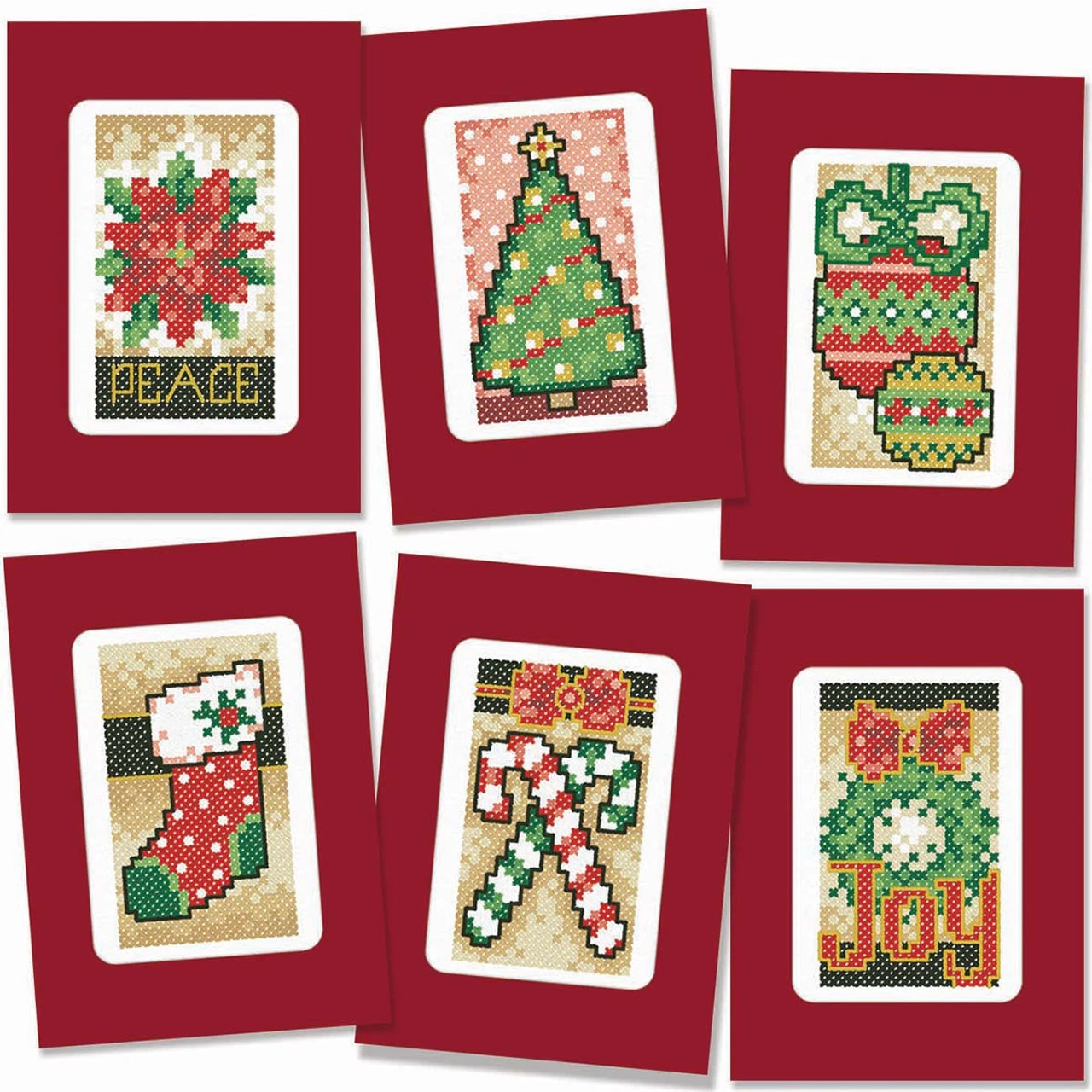 • These greeting cards are ready for stitching with a Christmas tree, stocking, wreath with the word “joy”, poinsettia with the word “peace”, candy canes, and ornaments.