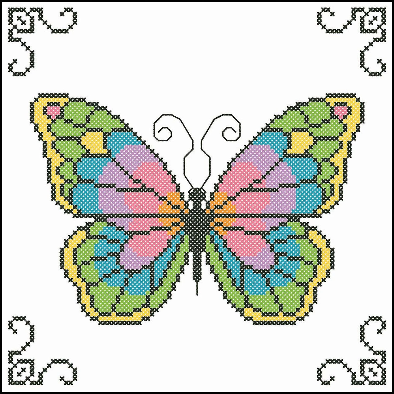 • These quilt blocks are ready for stitching with a stained glass-inspired butterfly with wings in a neon rainbow gradient and wrought iron-inspired curlicues on each corner.