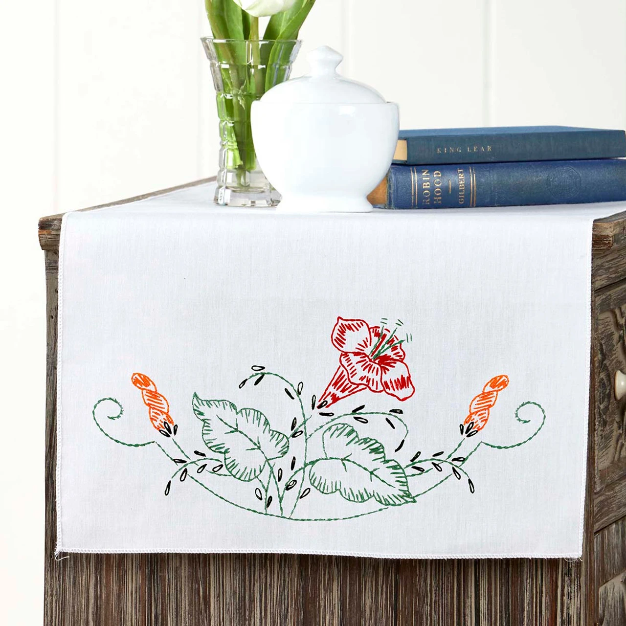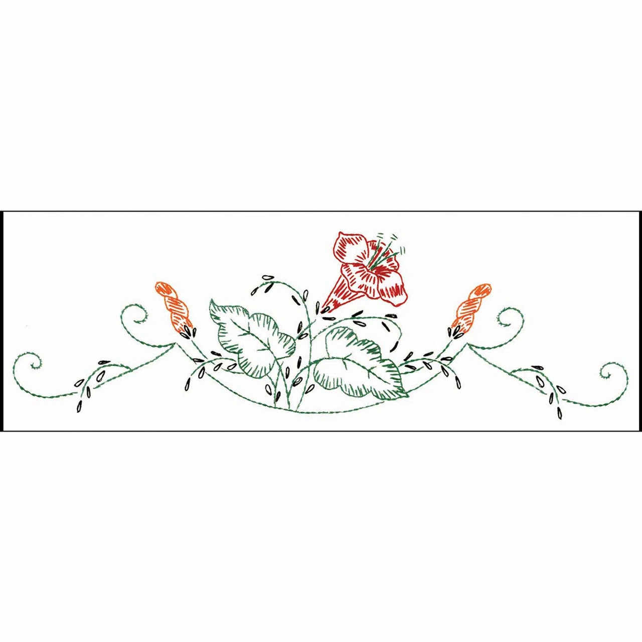 • This pre-finished dresser scarf is ready for stitching with red and orange flowers surrounded by green vines and leaves.