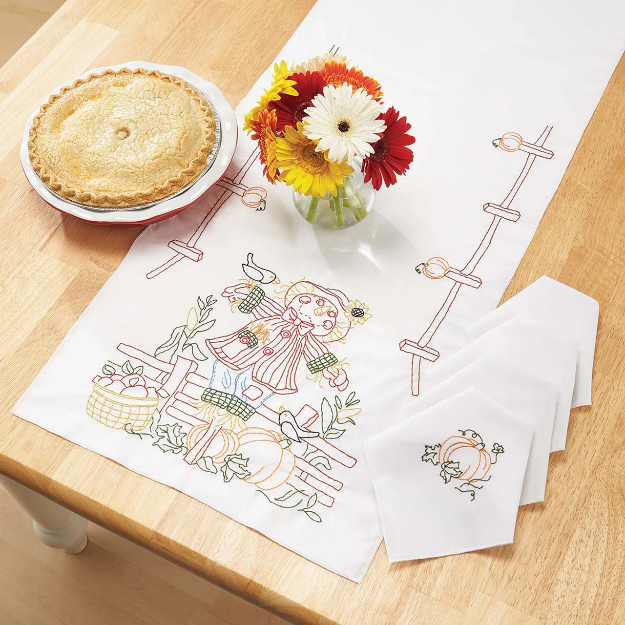 • These pre-finished table runner and napkins are ready for stitching with a smiling scarecrow surrounded by apples, pumpkins, and crows.