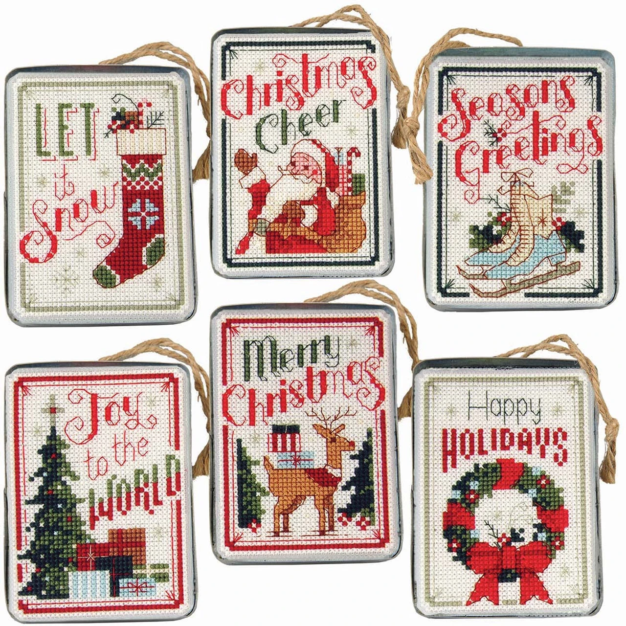 • This ornament kit features a reindeer, ice skates, Santa, a Christmas tree, a Christmas wreath, and a stocking with various holiday greetings and sayings.