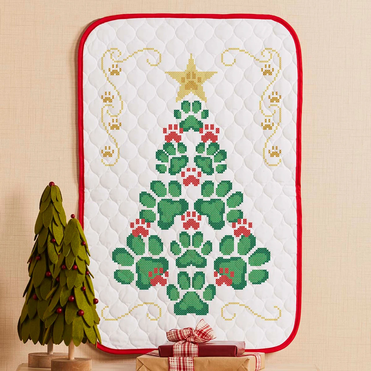 • This cross-stitch wall hanging is ready for stitching with variety of green and red paw prints in the shape of a Christmas tree with gold paw prints and curlicues in the corners.