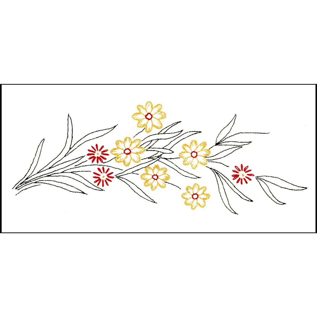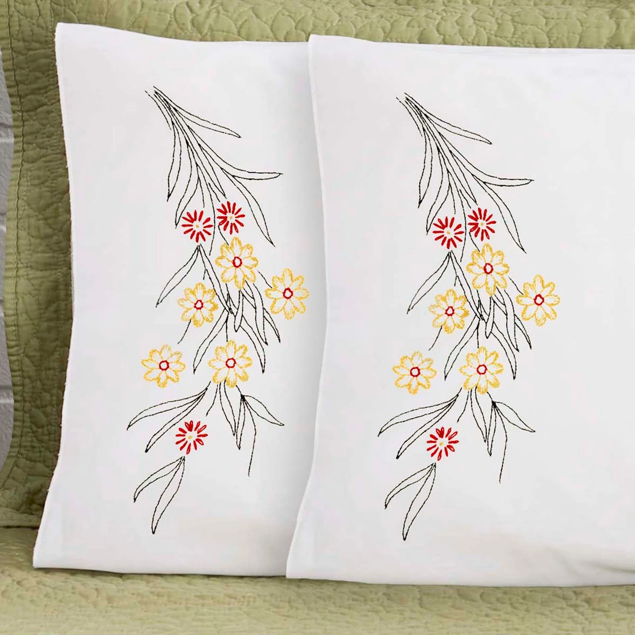 • These pre-finished pillowcases are ready for stitching with yellow and orange flowers with long green leaves.