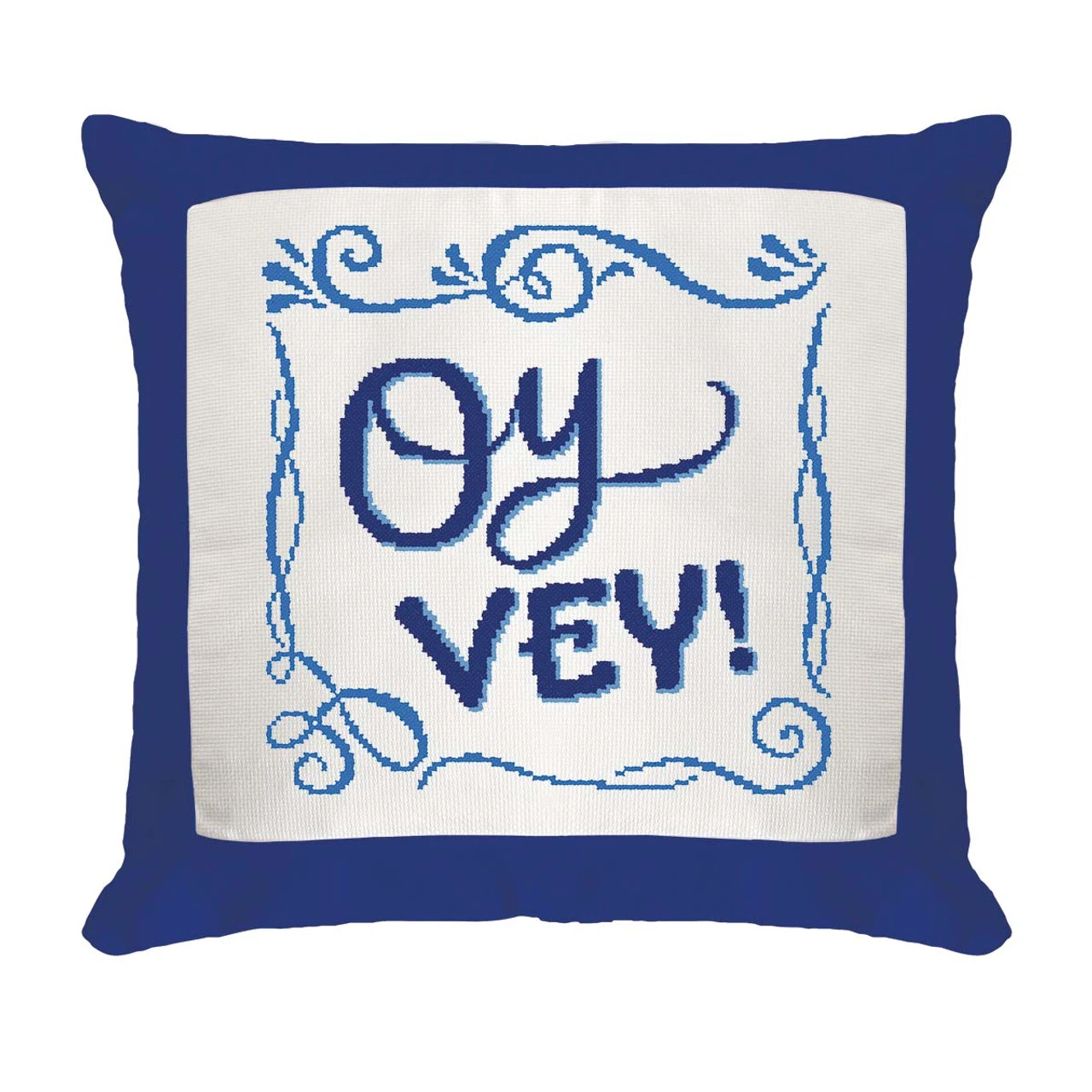 • Designs feature the words “Oy Vey” surrounded by a blue filigree border.