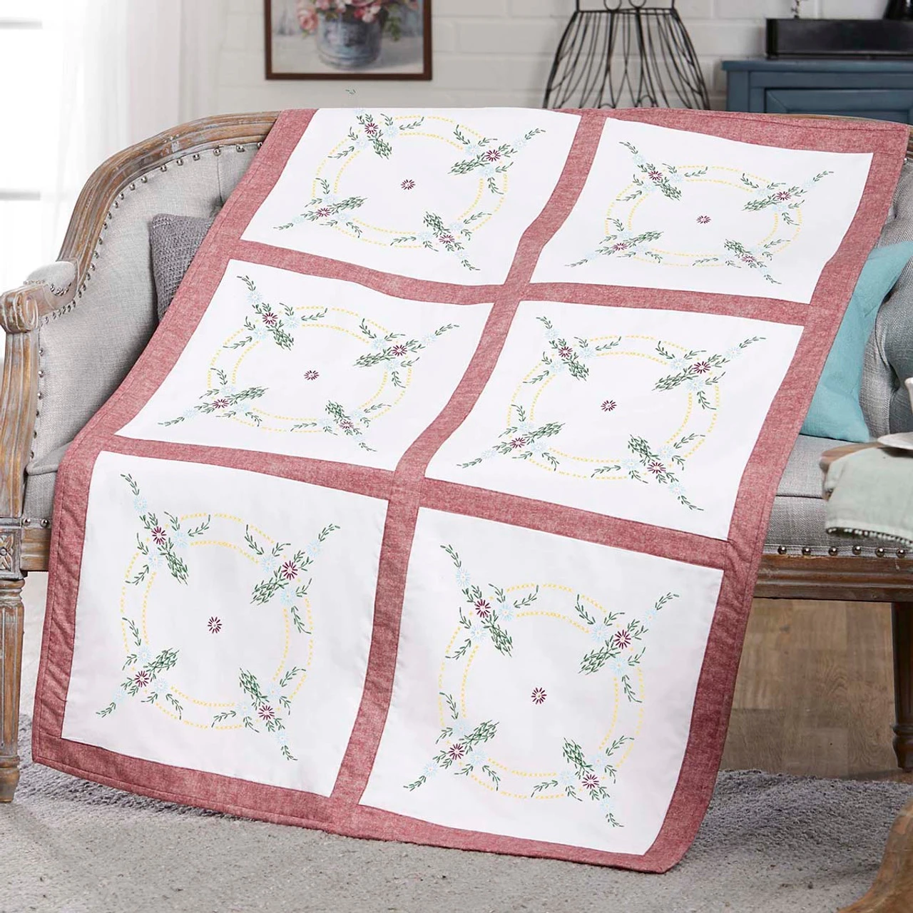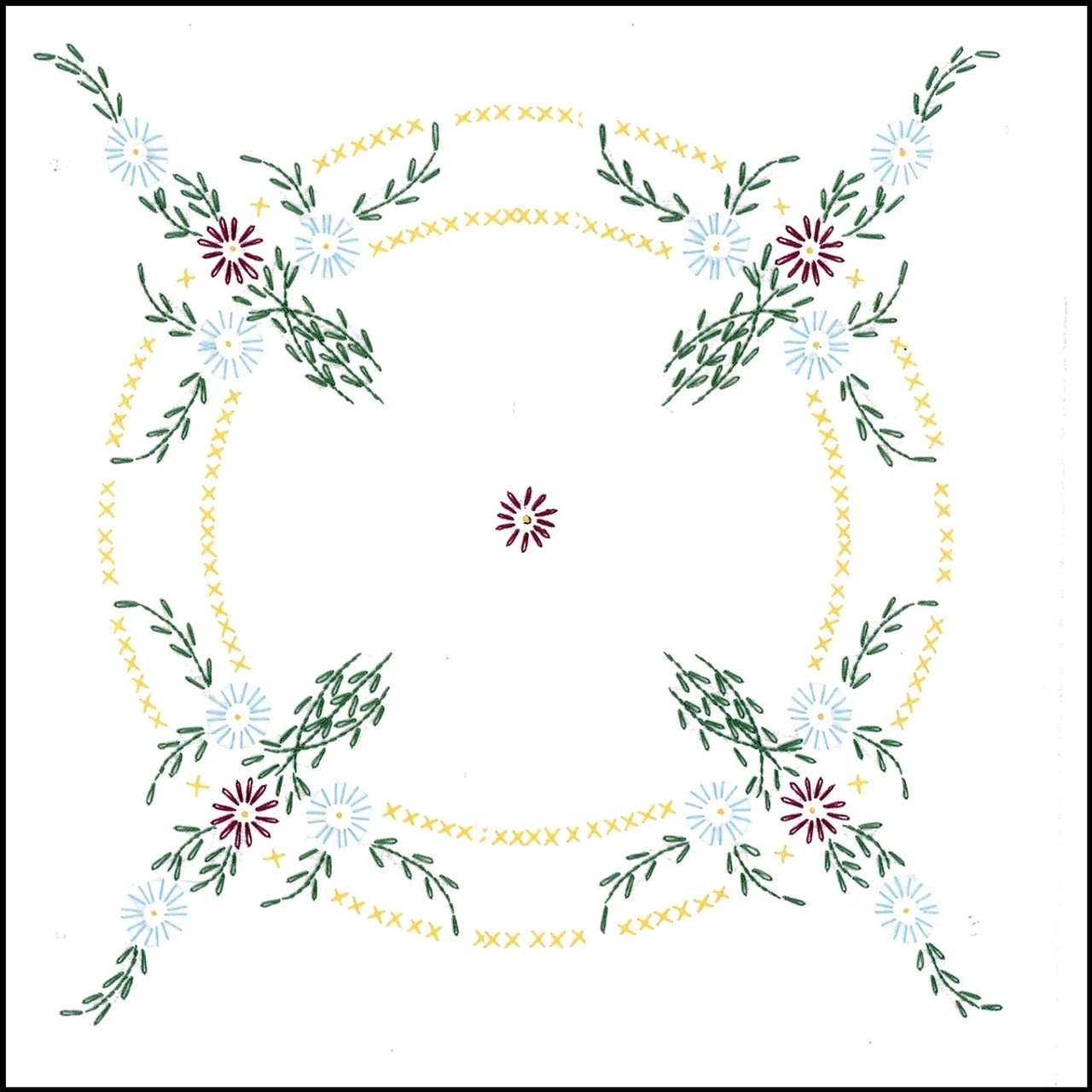 • Quilt blocks are stamped for embroidery on white polyester/cotton fabric.