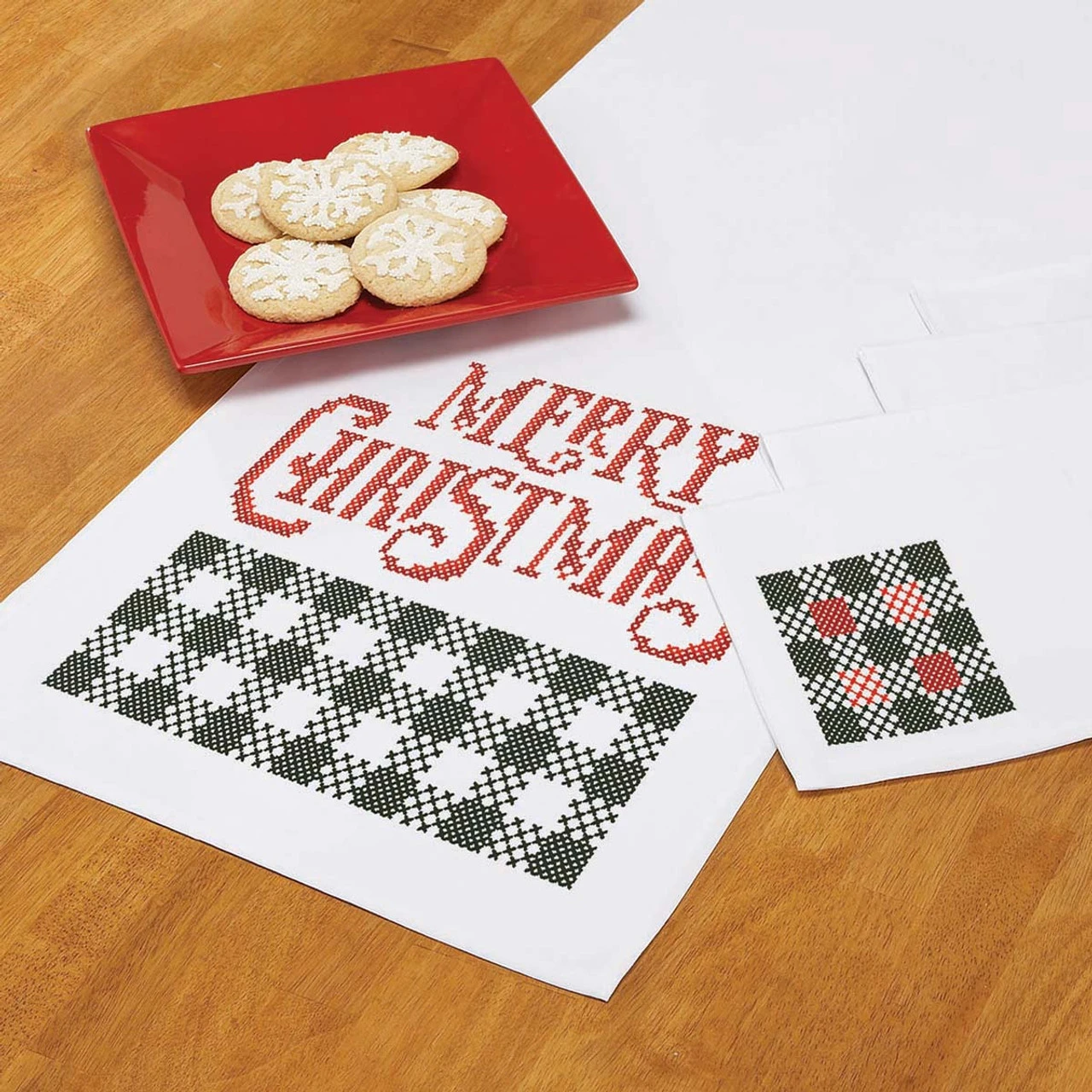 Decorate your table with a merry message and cozy buffalo plaid. Stamped for cross-stitch on white polyester/cotton fabric with a perle edge; 14 × 44″ (36 x 112cm) table runner; 16 × 16″ (41 x 41cm) napkins. Made in U.S.A.