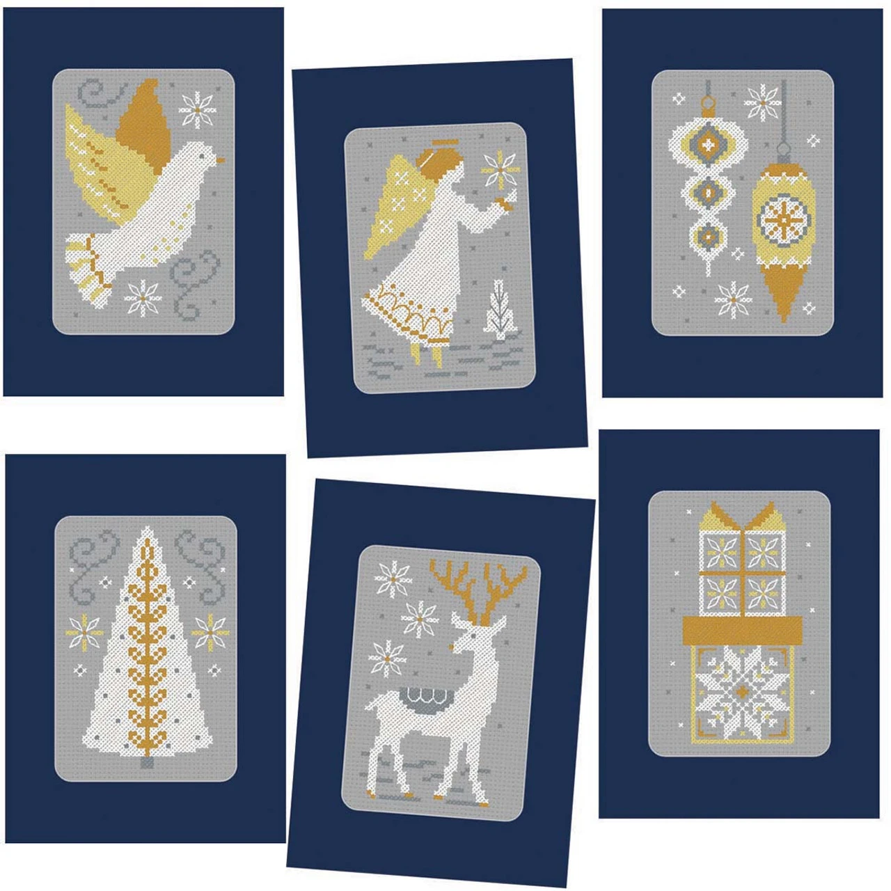 • This counted cross-stitch kit includes pewter 14-ct. aida cloth, cotton and metallic floss, tri-fold cards with envelopes, needle, and instructions.