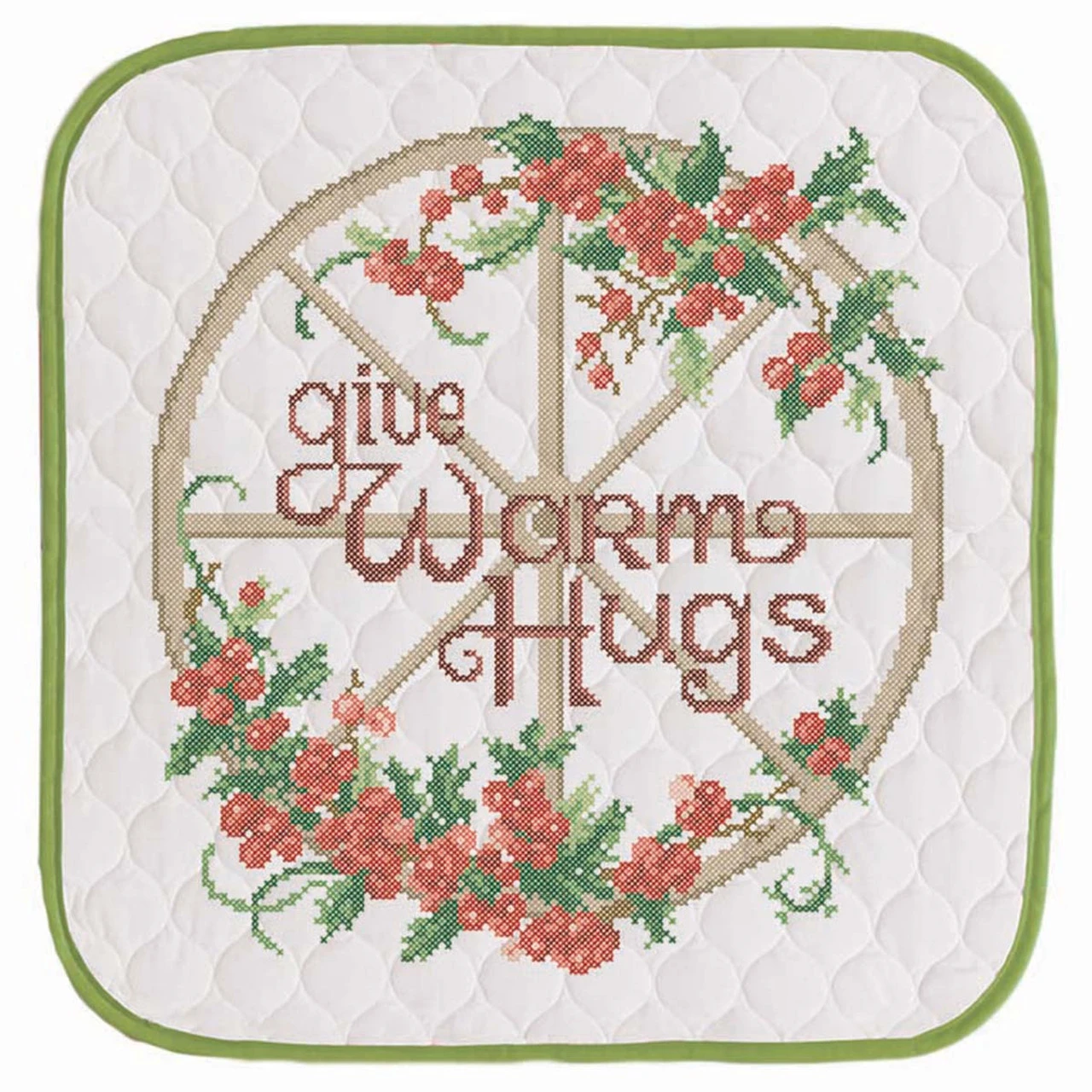 • This pre-finished wall hanging is stamped for cross-stitch on pre-quilted white polyester/cotton fabric with an olive green binding.