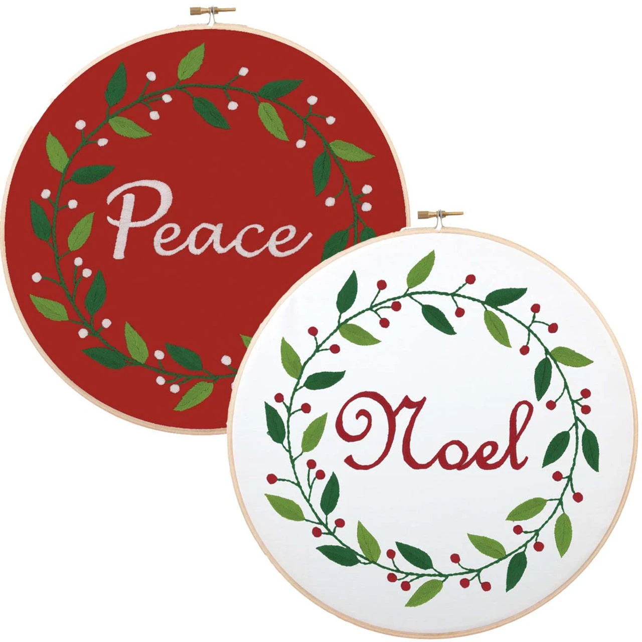 Deck your halls with a pair of seasonal sentiments. Stamped for embroidery on white or red polyester/cotton fabric. Kit includes cotton floss, wooden hoops, and needle. Set of two. 10″ (25cm) dia. Made in U.S.A.