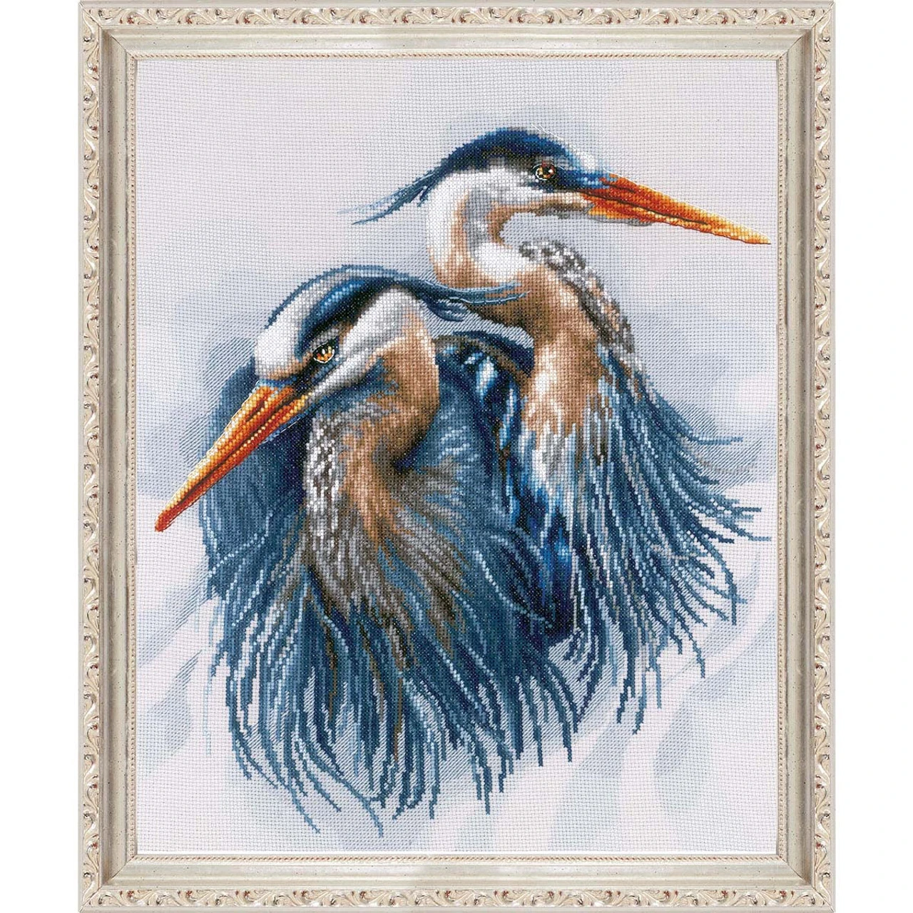 • Design features a portrait of two blue herons with long blue-gray feathers.