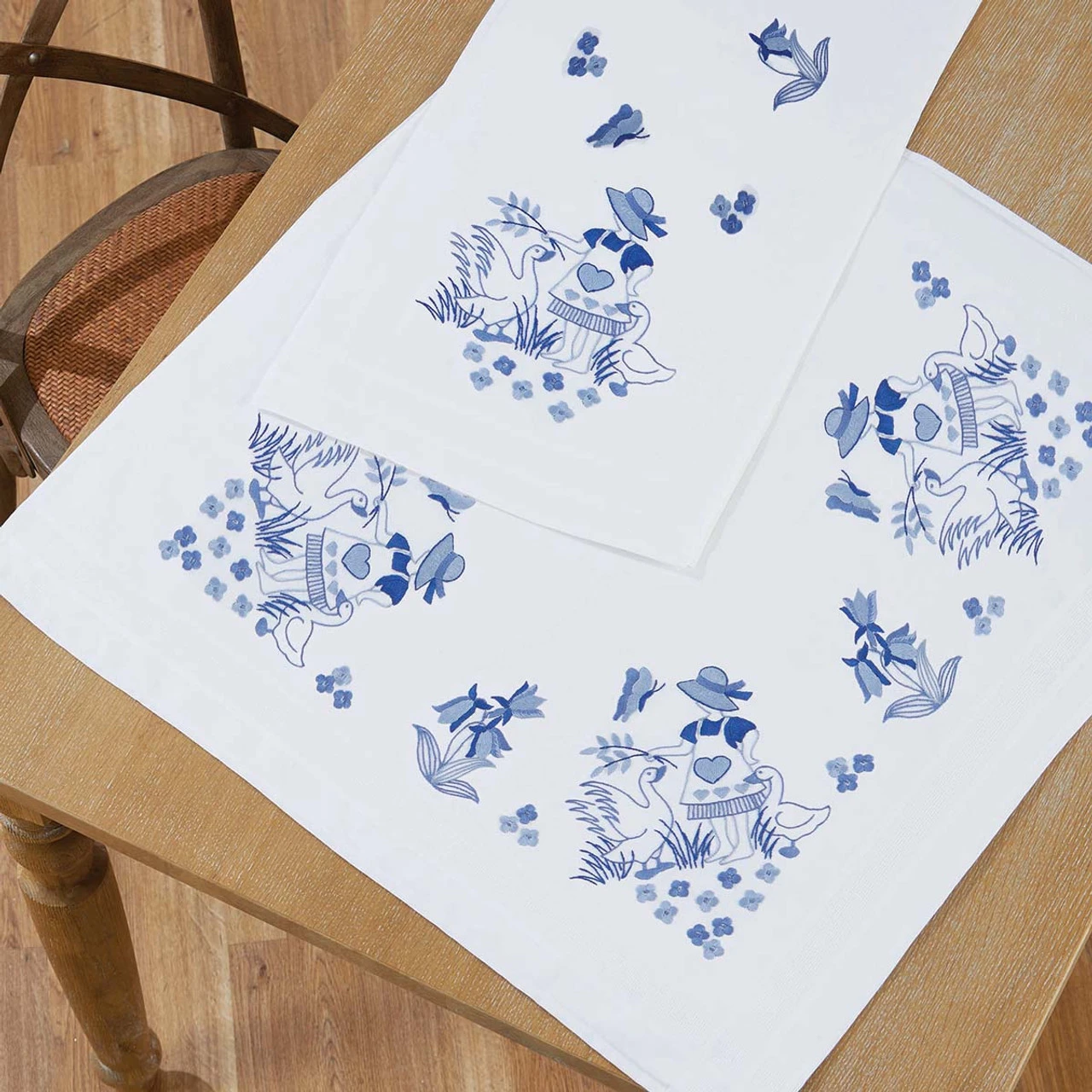 • These pre-finished table topper and table runner are ready for stitching with a girl in a dress and straw hat with a pair of geese and a butterfly in a flower garden.