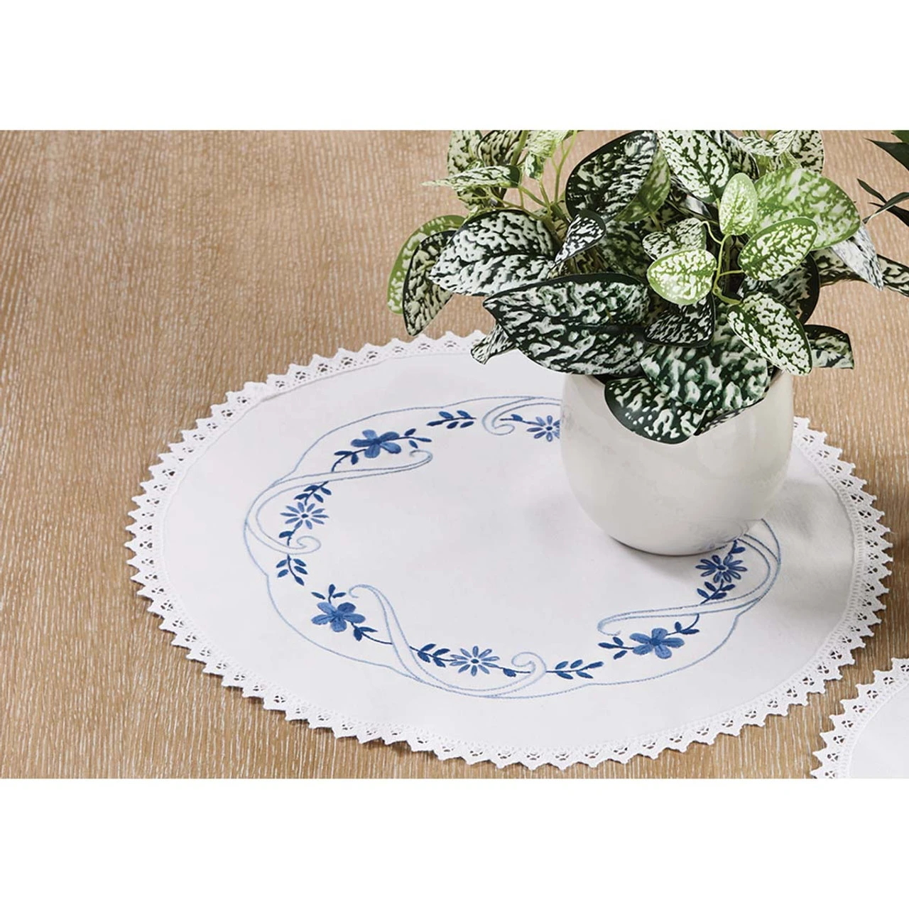 A lace-trimmed doily stitched with blue florals is a classic accent for your table. Stamped for embroidery on white cotton fabric with a lace edge. Kit includes cotton floss, floss organizer, and needle. 17″ (43cm) dia. Imported from Europe.