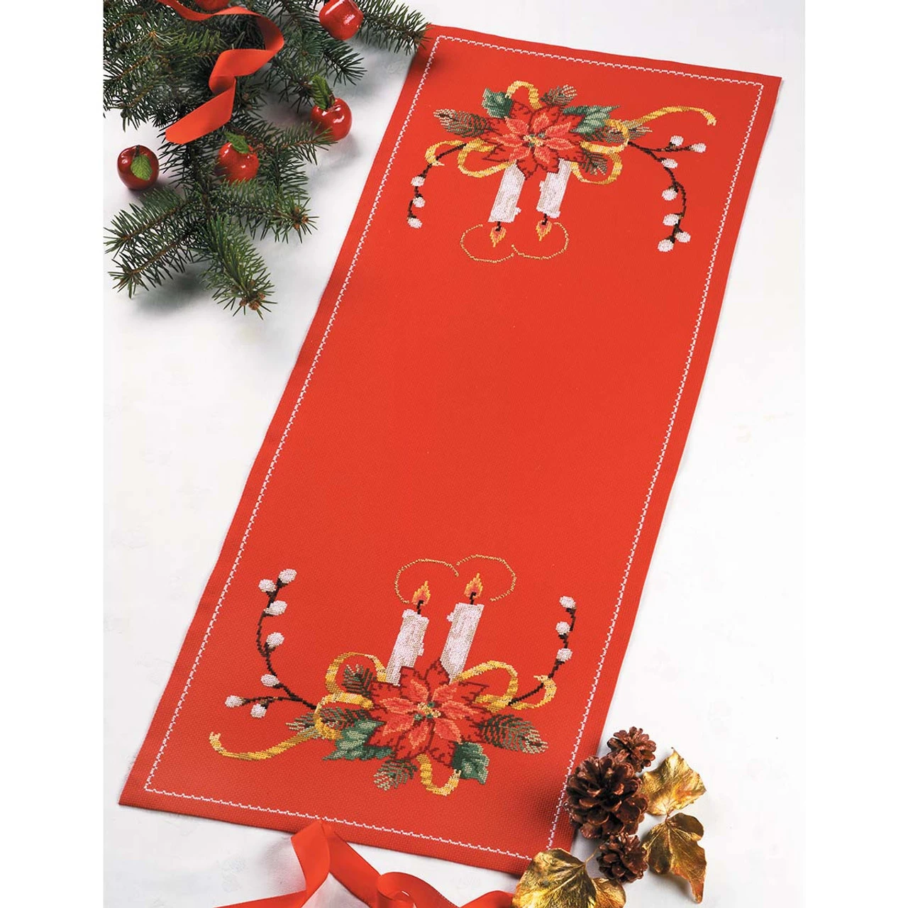 Bring a sense of tradition to your holiday feast with this elegant candle design trimming your table. Counted cross-stitch kit includes 14-ct. red pearl aida, cotton floss, and needle. 14 x 36″ (36 x 91cm). Imported from Europe.