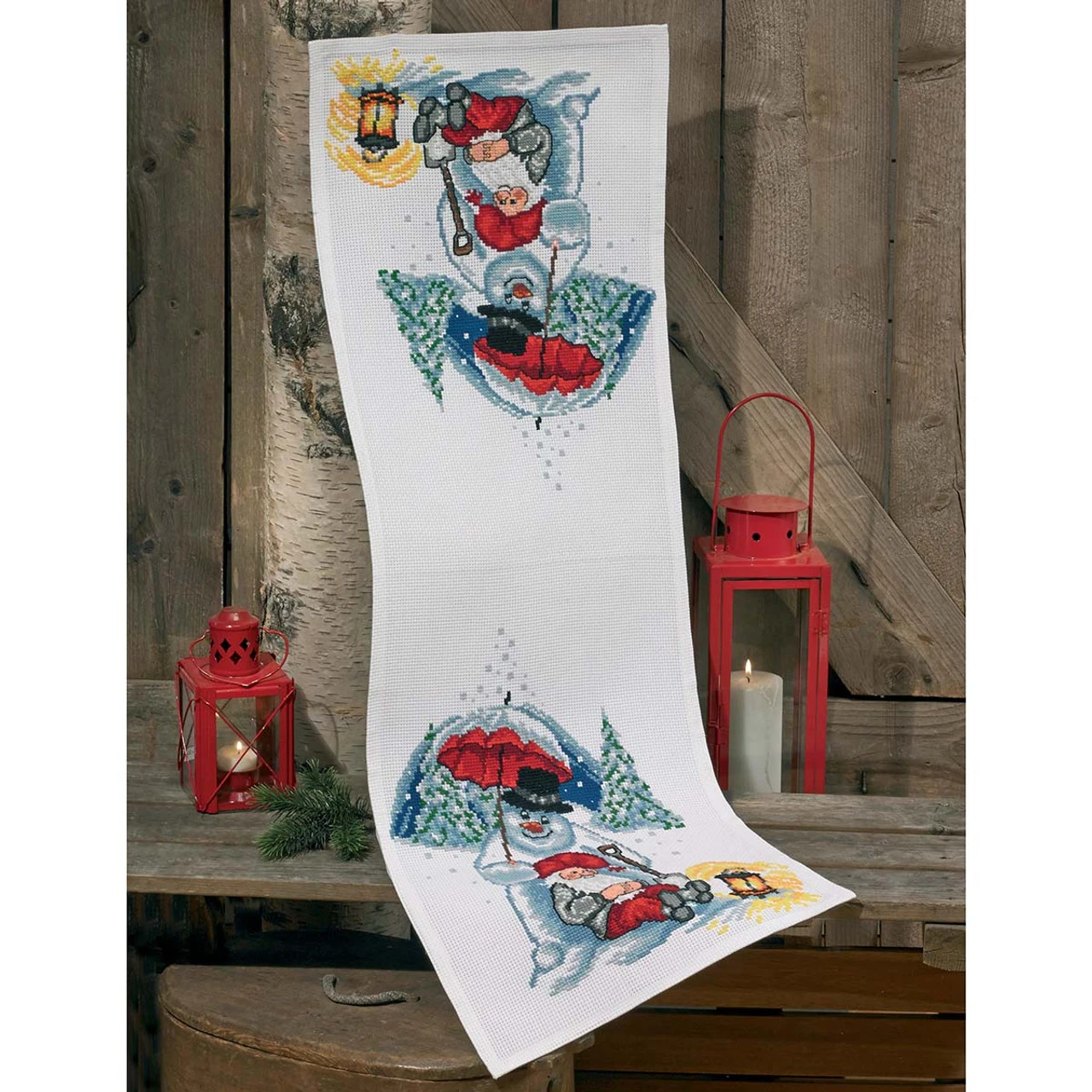 Set the scene for a merry holiday feast with this joyful scene from the North Pole. Counted cross-stitch kit includes white 8-ct. aida, cotton floss, and needle. 16 x 41″ (41 x 104cm). Imported from Europe.